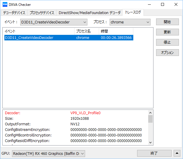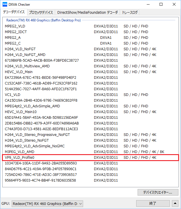 そこでこのキーを削除するかもしくは値を「1」にすると「VP9_VLD_Profile0」が表示される様になり、
